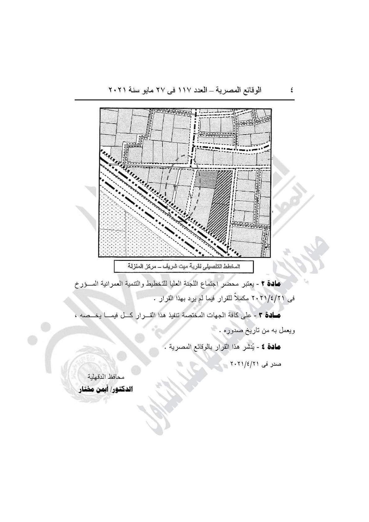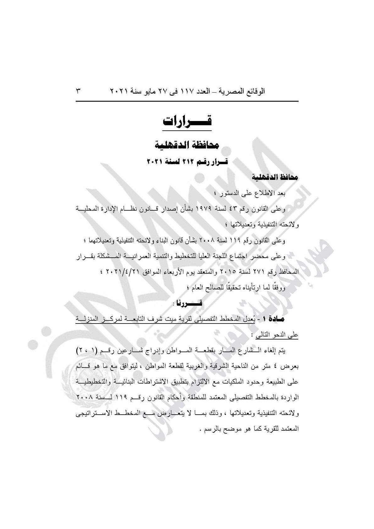 -القرار رقم 212 لسنة 2021، بتعديل المخطط التفصيلي لقرية ميت شرف التابعة لمركز المنزلة، بإلغاء الشارع المار بقطعة المواطن وإدراج شارعين رقم (1 ، 2) بعرض 4 متر من الناحية الشرقية والغربية لقطعة المواطن، ليتوافق مع ما هو قائم على الطبيعة وحدود الملكيات مع الالتزام بتطبيق الاشتراطات البنائية والتخطيطية الواردة بالمخطط التفصيلى المعتمد للمنطقة وأحكام القانون رقم 119 لسنة 2008 ولائحته التنفيذية وتعديلاتها، وذلك بما لا يتعارض مع المخطط الاستراتيجى المعتمد للقرية.
