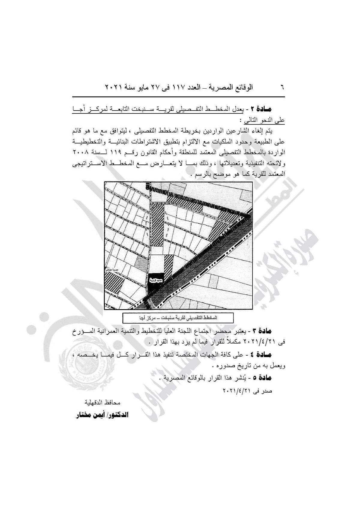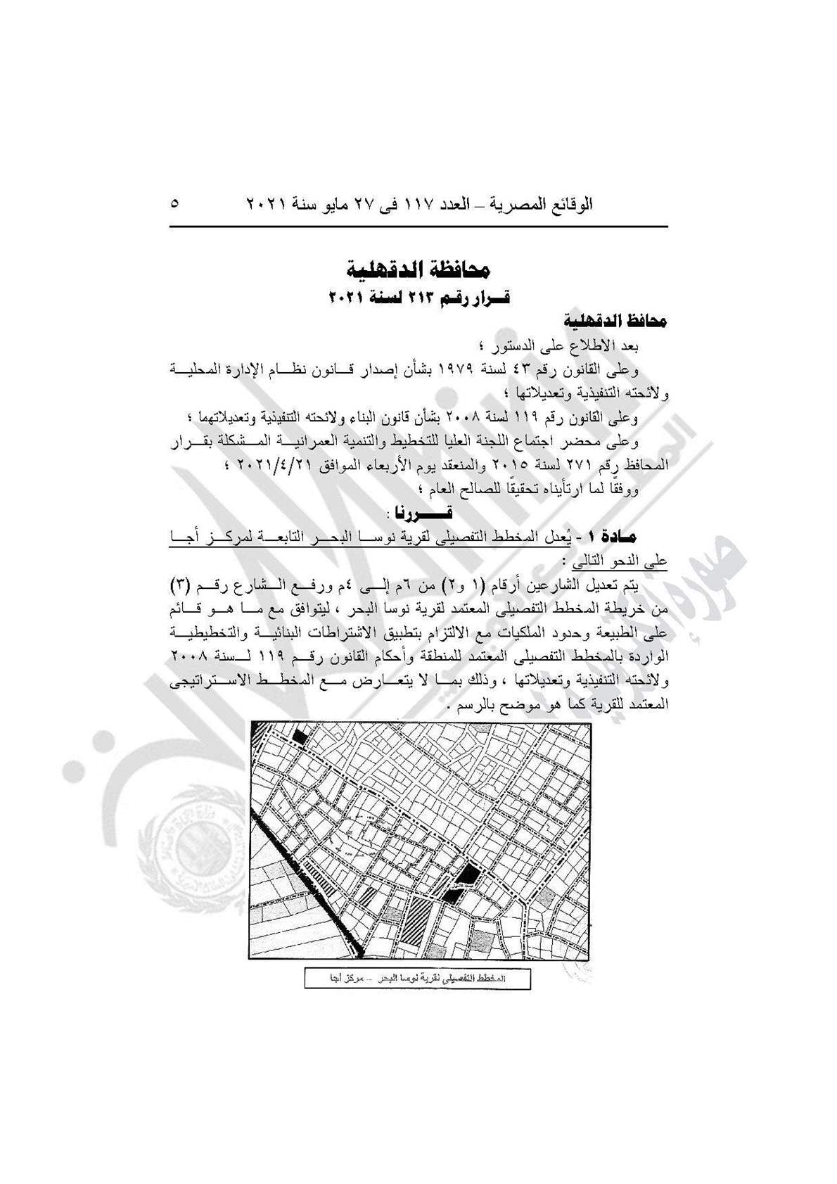 -القرار رقم 213 لسنة 2021، بتُعديل المخطط التفصيلى لقرية نوسا البحر التابعة لمركز أجا على النحو التالي: "يتم تعديل الشارعين أرقام (1 و2) من 6متر إلى 4 متر ورفع الشارع رقم (3) من خريطة المخطط التفصيلى المعتمد لقرية نوسا البحر، ليتوافق مع ما هو قائم على الطبيعة وحدود الملكيات مع الالتزام بتطبيق الاشتراطات البنائية والتخطيطية الواردة بالمخطط التفصيلي المعتمد للمنطقة وأحكام القانون رقم 119 لسنة 2008 ولائحته التنفيذية وتعديلاتها، وذلك بما لا يتعارض مع المخطط الاستراتيجي المعتمد للقرية.