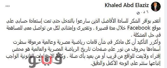 وقال خالد عبد العزيز: "أتقدم بوافر الشكر للسادة الأفاضل الذين سارعوا بالتدخل حتى تمت استعادة حسابى على موقع Facebook خلال مدة قصيرة، وتقديرى وامتنانى لكل مَن تواصل معى للمساهمة فى حل المشكلة".