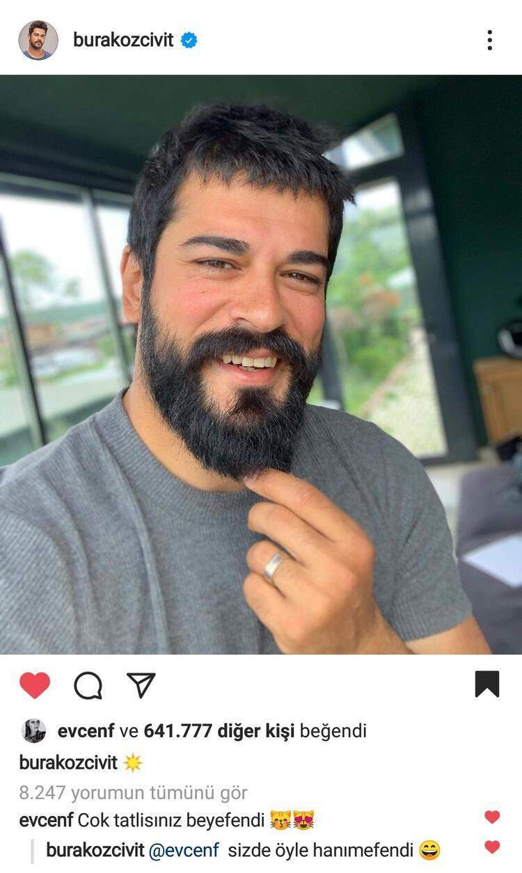 وغازلت فهرية زوجها من خلال التعليق على صورته قائلة "أنت حلو جدا يا سيدي"، ورد عليها الممثل التركي الشهير بـ "أنت أيضًا يا سيدتي".