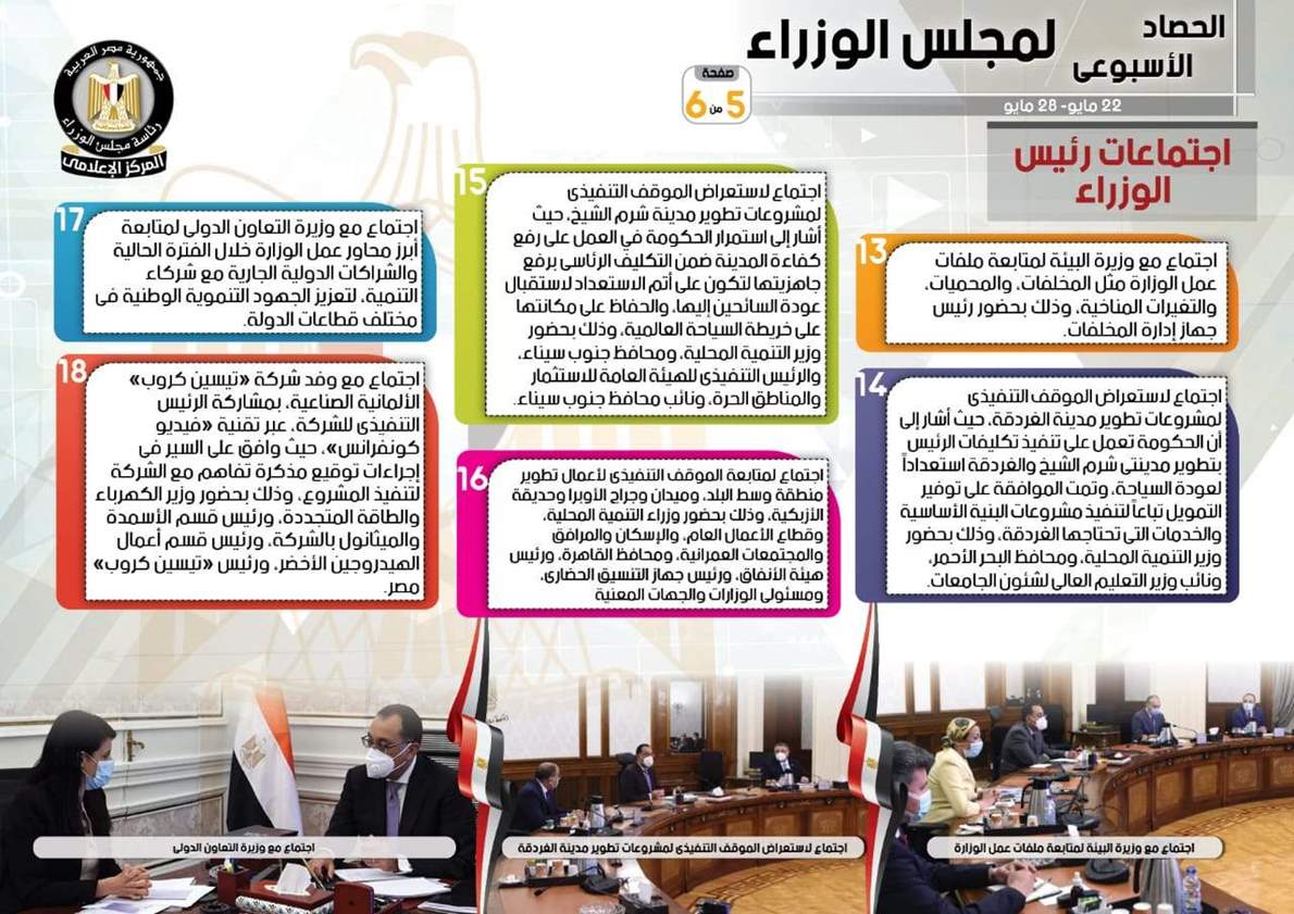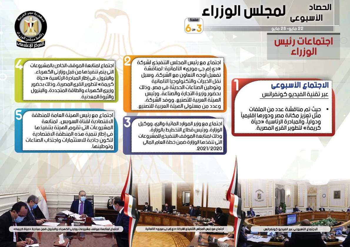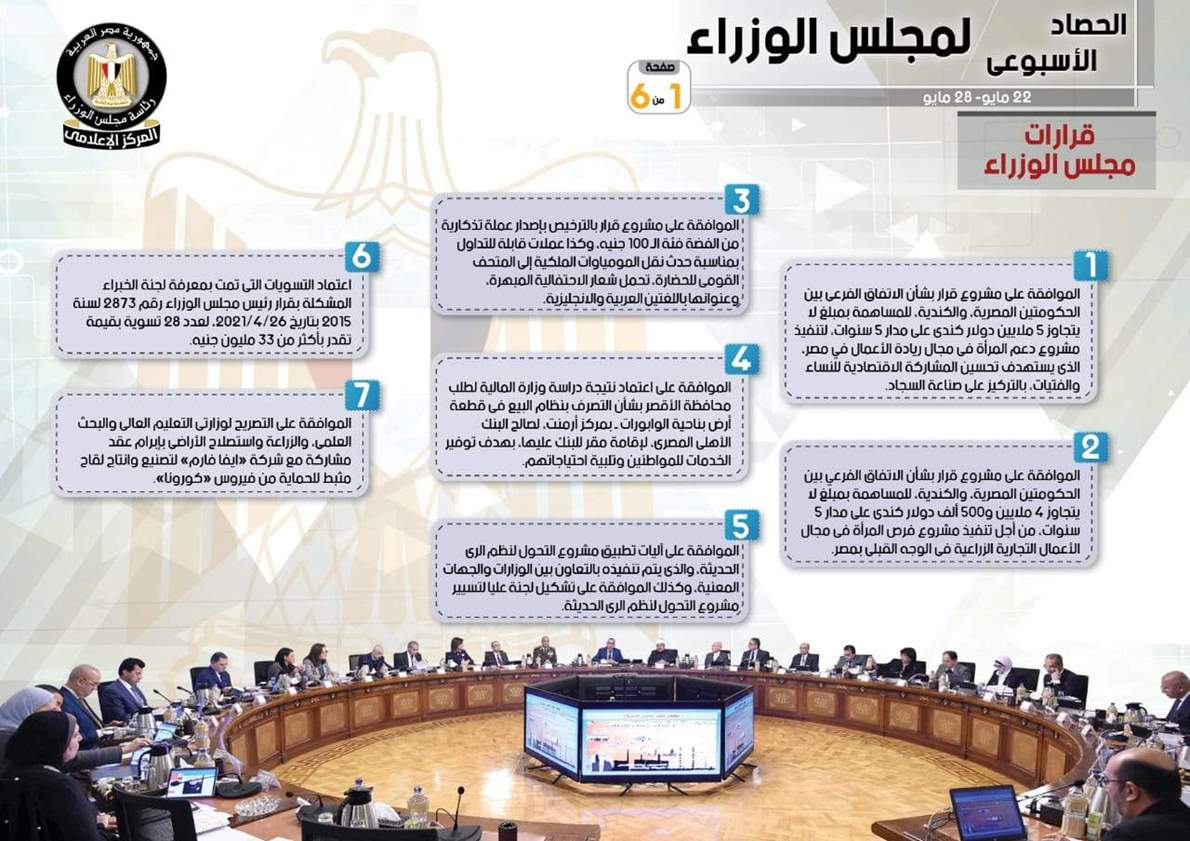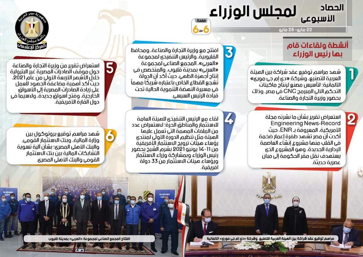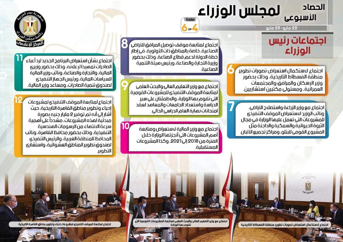 نشر المركز الإعلامي لمجلس الوزراء، تقريراً شمل إنفوجرافات سلط من خلالها الضوء على الحصاد الأسبوعي لمجلس الوزراء، وذلك خلال الفترة من 22 حتى 28 مايو 2021، والذي تضمن الموافقة على عدد من القرارات، فضلاً عن الاجتماعات واللقاءات التي عقدها الدكتور مصطفى مدبولي، رئيس مجلس الوزراء، بالإضافة إلى ما قام به من أنشطة.