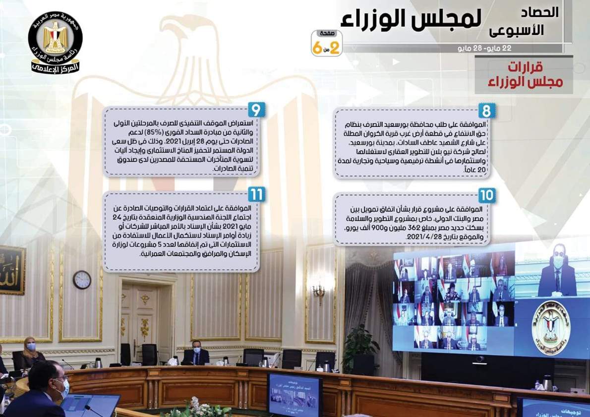 وتمت الموافقة على اعتماد القرارات والتوصيات الصادرة عن اجتماع اللجنة الهندسية الوزارية المنعقدة بتاريخ 24 مايو 2021 بشأن الإسناد بالأمر المباشر للشركات أو زيادة أوامر الإسناد لاستكمال الأعمال للاستفادة من الاستثمارات التي تم إنفاقها لـ 5 مشروعات لوزارة الإسكان والمرافق والمجتمعات العمرانية، إلى جانب الموافقة على مشروع قرار بشأن اتفاق تمويل بين مصر والبنك الدولي، خاص بمشروع التطوير والسلامة بسكك حديد مصر بمبلغ 362 مليون و900 ألف يورو، والموقع بتاريخ 28 /4 /2021.