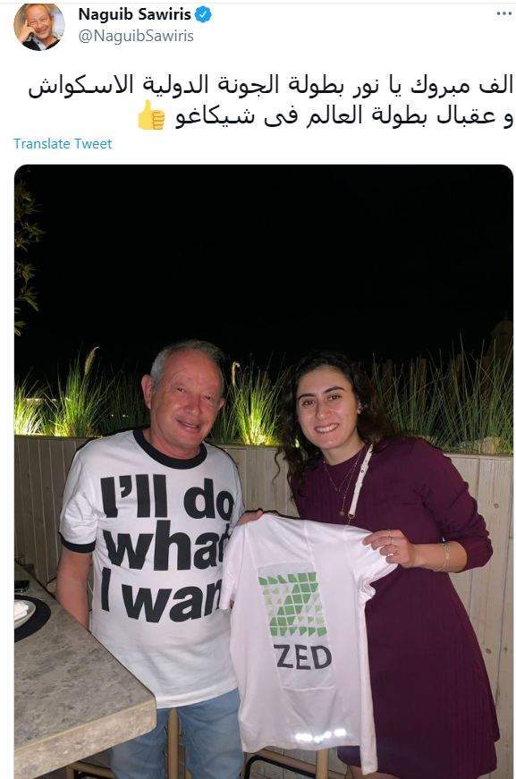 ونشر نجيب ساويرس صورة له رفقة نور الشربيني معلقًا عليها قائلًا: "ألف مبروك يا نور بطولة الجونة الدولية للإسكواش وعقبال بطولة العالم فى شيكاغو".