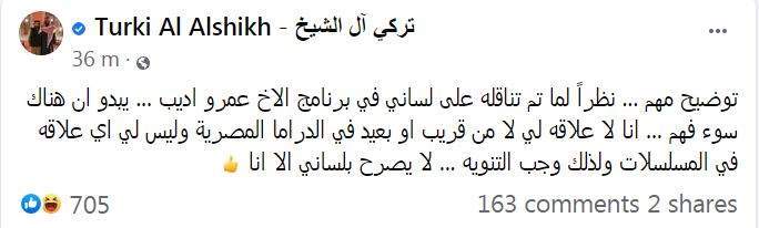 وكتب تركي آل الشيخ قائلًا: "توضيح مهم.. نظرًا لما تم تناقله على لساني في برنامج الأخ عمرو أديب.. يبدو أن هناك سوء فهم.. أنا لا علاقه لي لا من قريب أو بعيد في الدراما المصرية وليس لي أي علاقة في المسلسلات ولذلك وجب التنويه.. لا يصرح بلساني إلا أنا".