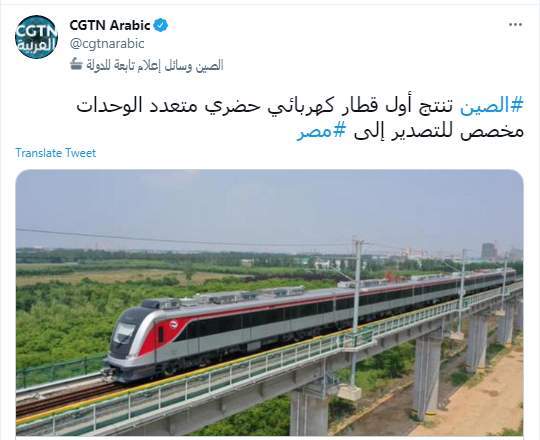 وكتب تليفزيون الصين " CGTN Arabic" عبر تويتر " #الصين تنتج أول قطار كهربائي حضري متعدد الوحدات مخصص للتصدير إلى #مصر".