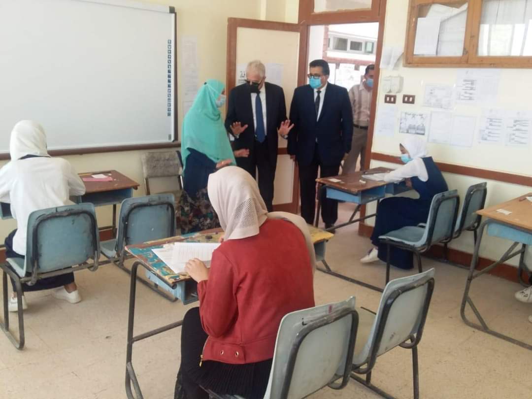 وخلال الزيارة اطمأن المحافظ على جودة تطبيق الإجراءات الاحترازية والوقائية باللجان بدءاً من دخول الطالبات للجان وحتى الوصول لحجرة الامتحان مشيدا معالية بتطبيق قواعد ومعايير سير اللجان وتوفر جميع الاحتياجات اللازمة للطلاب من مطهرات وكمامات .