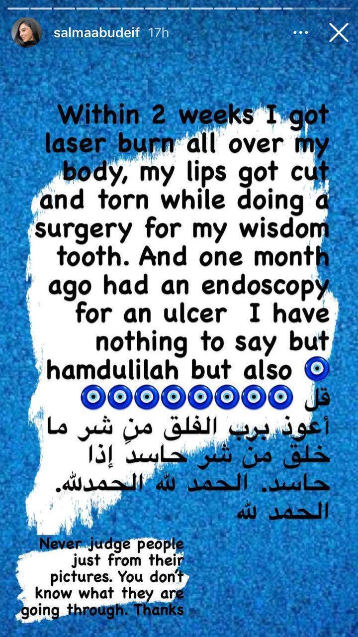 وكتبت "سلمى": "في خلال أسبوعين، تعرضت لحروق الليزر في جميع أنحاء جسدي، وتم قطع شفتاي أثناء إجراء عملية جراحية لضرس العقل، وقبل شهر أجريت منظارا للقرحة، ليس لدي ما أقوله سوى الحمد لله"، وتابعت: "لا تحكم أبدًا على الأشخاص فقط من صورهم، لأنك لا تعرف ما يمرون به، شكرًا".