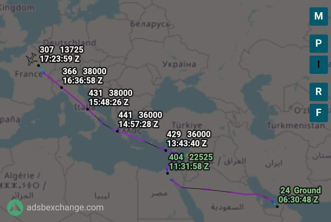 وكتب موقع إنتل سكاي INTELSKY عبر تويتر " طائرة رئيس الوزراء المكلف سعد الحريري طائرة خاصة المملكة العربية السعودية، بوينج 737NG 8AN/W BBJ2 (VP-CKA, 4247D2)) كان آخر نشاط لها كطائرة #VPCKA في 23/5/2021 الساعة 17:49 في مطار لو بورجيه، فرنسا".