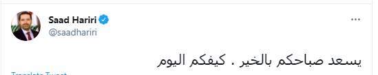 كما أكد سعد الحريري على ذلك اليوم الاحد، بنشره تغريدة يلقي فيها بتحية الصباح على اللبنانيين ويسألهم عن حالهم.