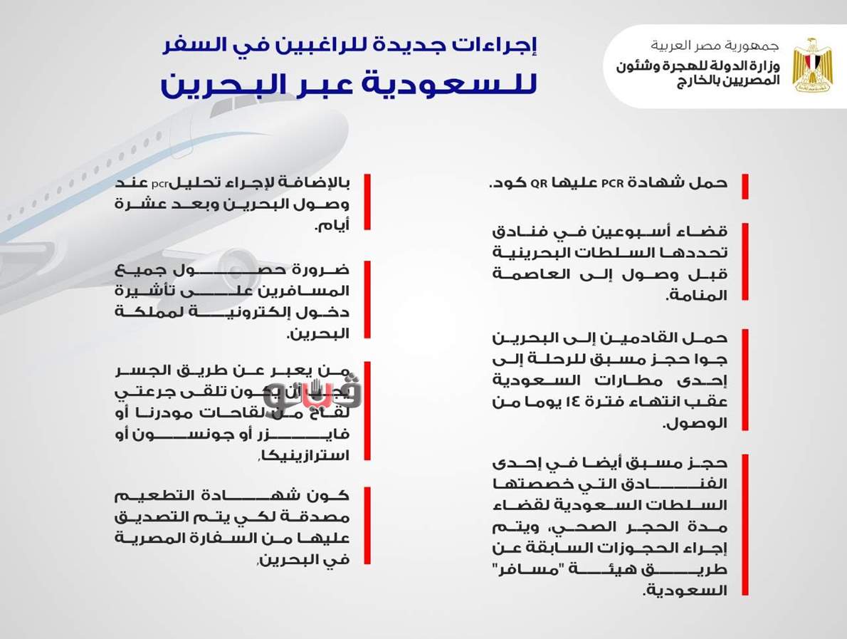 بالإضافة لإجراء تحليلpcr عند وصول البحرين وبعد عشرة أيام، مع ضرورة حصول جميع المسافرين على تأشيرة دخول إلكترونية لمملكة البحرين، ومن يعبر عن طريق الجسر يجب أن يكون تلقى جرعتي لقاح من لقاحات مودرنا أو فايزر أو جونسون أو استرازينيكا، وتكون شهادة التطعيم مصدقة لكي يتم التصديق عليها من السفارة المصرية في البحرين.