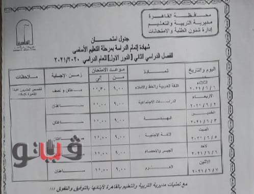 اعتمد الدكتور محمد هانى غنيم محافظ بنى سويف، جداول امتحان شهادة اتمام مرحلة التعليم الأساسي "الشهادة الإعدادية العامة والمهنية" للعام الدراسي 2020/2021 "عام ومهني".