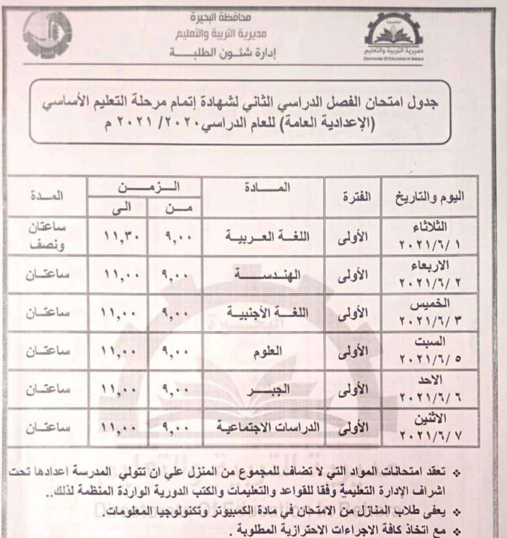 جدول امتحانات الشهادة الإعدادية بالبحيرة