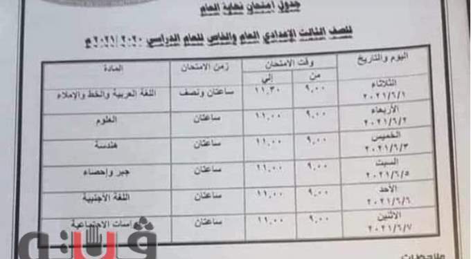 جدول امتحانات الصف الثالث الإعدادي الترم الثاني 2021