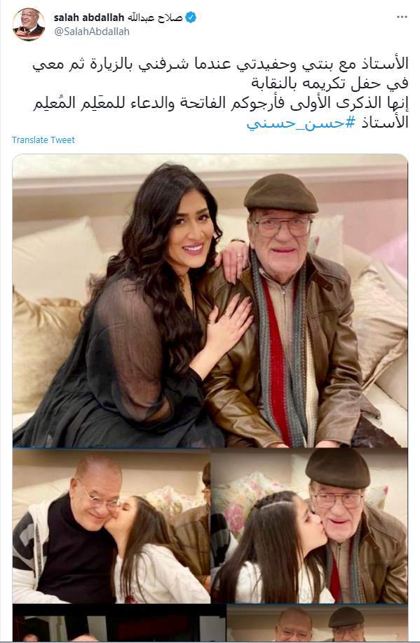 ونشر صلاح عبد الله صورا جمعت الفنان الراحل بأبنائه وأحفاده معلقا عليها قائلا: "الأستاذ مع بنتي وحفيدتي عندما شرفني بالزيارة ثم معي في حفل تكريمه بالنقابة.. إنها الذكرى الأولى فأرجوكم الفاتحة والدعاء للمعَلِم المُعلِم الأستاذ #حسن_حسني".