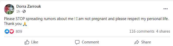 وكتبت درة قائلة: "يرجى التوقف عن نشر الشائعات عني!.. أنا لست حاملا ومن فضلكم احترموا حياتي الشخصية.. شكرا لكم".
