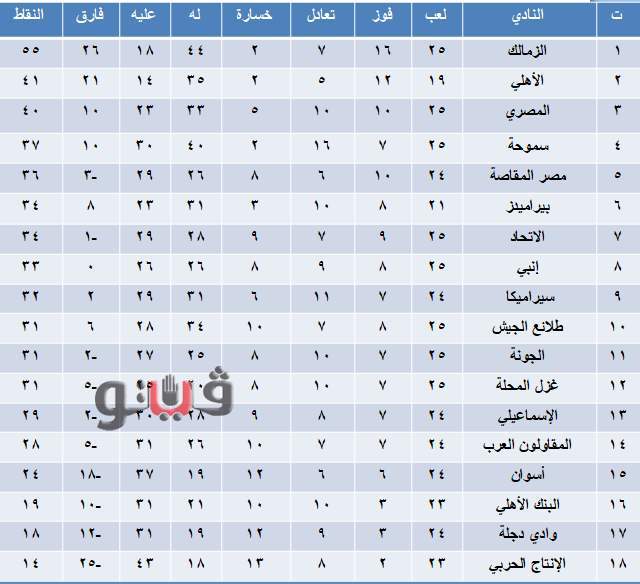 وجاء جدول ترتيب الدوري المصري الممتاز كالتالي: