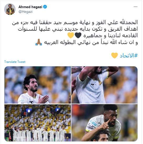 وكتب أحمد حجازي تغريدة على تويتر "الحمدلله علي الفوز ونهاية موسم جيد حققنا فيه جزء من أهداف الفريق تكون بدايه جديدة نبني عليها للسنوات القادمة لنادينا وجماهيره.. وان شاء الله نبدأ من نهائي البطوله العربيه.. #الاتحاد"