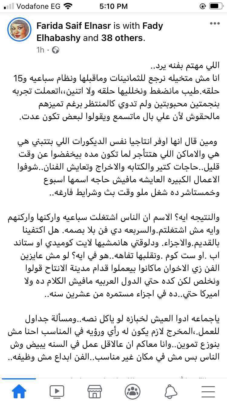 وتابعت "فريدة":" ومين قال انها اوفر انتاجيا نفس الديكورات اللي بتتبني هي هي والاماكن اللي هتتأجر لما تكون مده بيخفضوا عن وقت قليل..حاجات كتير والكتابه والاخراج وتعايش الفنان..شوفوا الاعمال الكبيره العايشه مافيش حاجه اسمها اسبوع وخمستاشر ده شغل ملو وقت بث وشرايط فارغه.