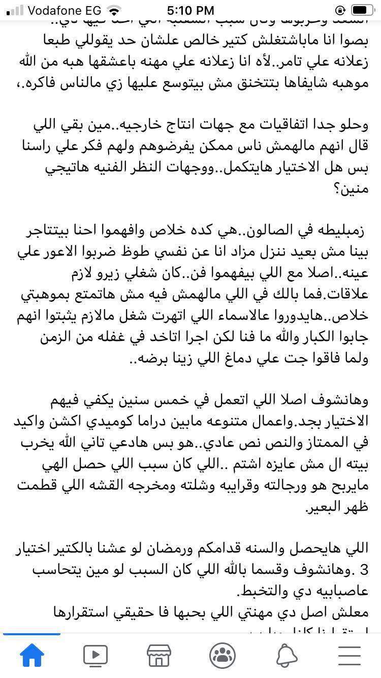 وأضافت: هانشوف اصلا اللي اتعمل في خمس سنين يكفي فيهم الاختيار بجد.واعمال متنوعه مابين دراما كوميدي اكشن واكيد في الممتاز والنص نص عادي..هو بس هادعي تاني الله يخرب بيته ال مش عايزه اشتم ..اللي كان سبب اللي حصل الهي مايربح هو ورجالته وقرايبه وشلته ومخرجه القشه اللي قطمت ظهر البعير.