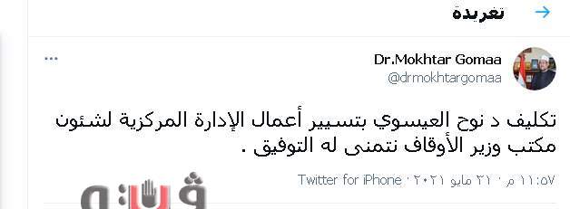 أعلن وزير الأوقاف الدكتور محمد مختار جمعة، عبر صفحته الرسمية على مواقع التواصل الاجتماعي "تويتر" تكليف د. نوح العيسوي بتسيير أعمال الإدارة المركزية لشئون مكتب وزير الأوقاف.
