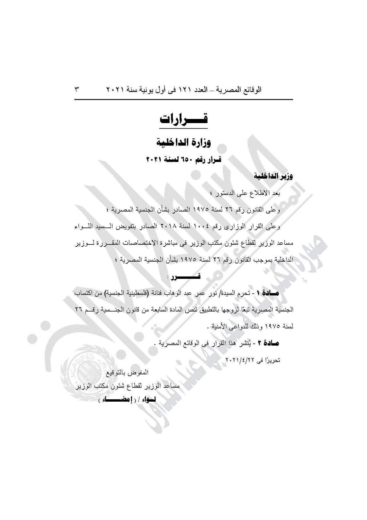 القرار رقم 650 لسنة 2021، بشأن حرمان السيدة نور عمر عبد الوهاب، فنانة فلسطينية الجنسية، من اكتساب الجنسية المصرية تبعًا لزوجها، بالتطبيق لنص المادة السابعة من قانون الجنسية رقم 26 لسنة 1975؛ وذلك لدواعٍ أمنية.