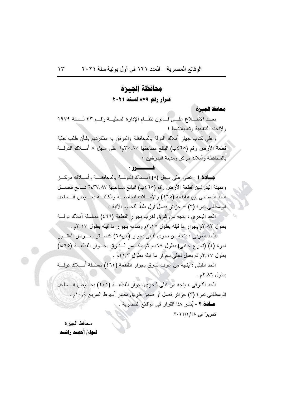 نشرت جريدة الوقائع المصرية في عددها رقم 121، الصادر في أول يونية 2021، قرار محافظة الجيزة رقم 879 لسنة 2021، بشأن تعلية على سجل (8) أملاك الدولة بالمحافظة وأملاك مركز ومدينة البدرشين.