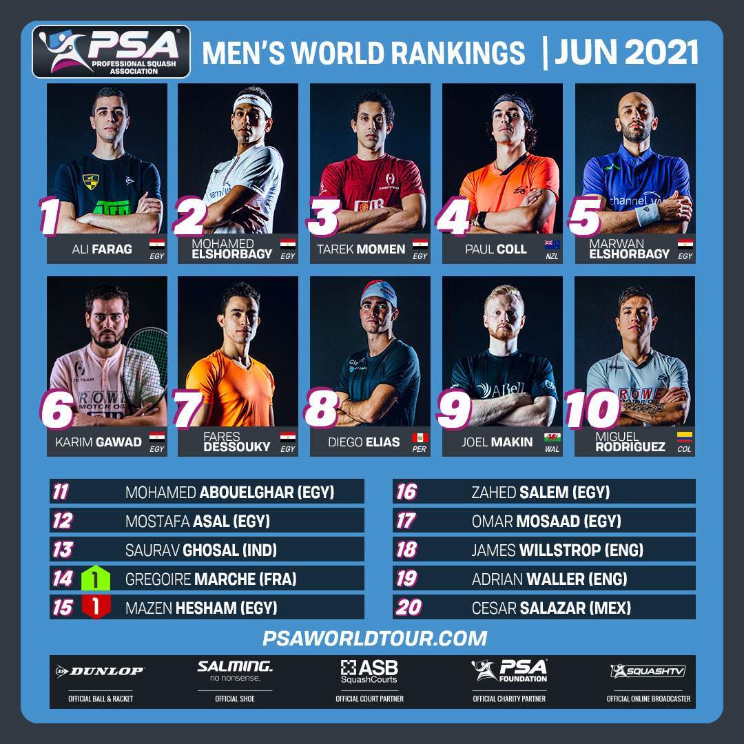 أعلنت رابطة اللاعبين المحترفين للإسكواش "PSA" عن التصنيف الجديد للاعبين فى شهر يونيو الجاري.