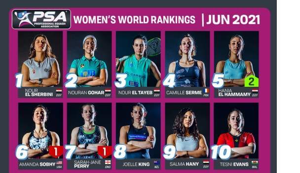 وأعلنت رابطة اللاعبين المحترفين للاسكواش "PSA" عن التصنيف الجديد للاعبات فى شهر يونيو.