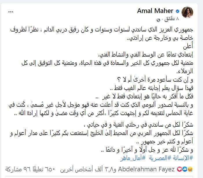 وقالت "أمال" فى منشور عبر حسابها على موقع التواصل الإجتماعي "فيس بوك": "جمهوري العزيز الذي ساندني لسنوات وسنوات و كان رفيق دربي الدائم ، نظرًا لظروف خاصة بي وخارجة عن إرادتي، أُعلن ابتعادي تمامًا عن الوسط الفني والنشاط الفني، متمنية لكل جمهوري كل الخير والسعادة في هذه الحياة، ومتمنية كل التوفيق إلى كل الزملاء".