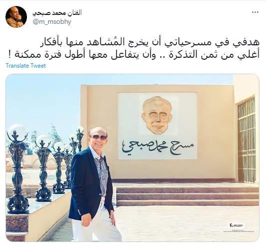 وكتب محمد صبحي تغريدة على تويتر "هدفي في مسرحياتي أن يخرج المُشاهد منها بأفكار أغلي من ثمن التذكرة.. وأن يتفاعل معها أطول فترة ممكنة!"