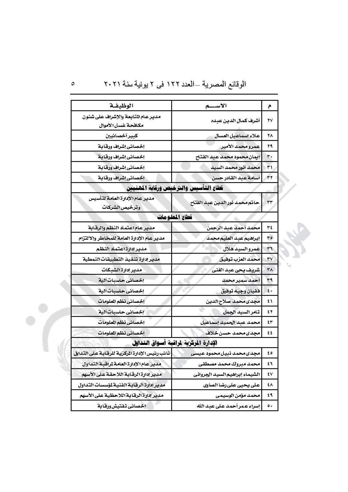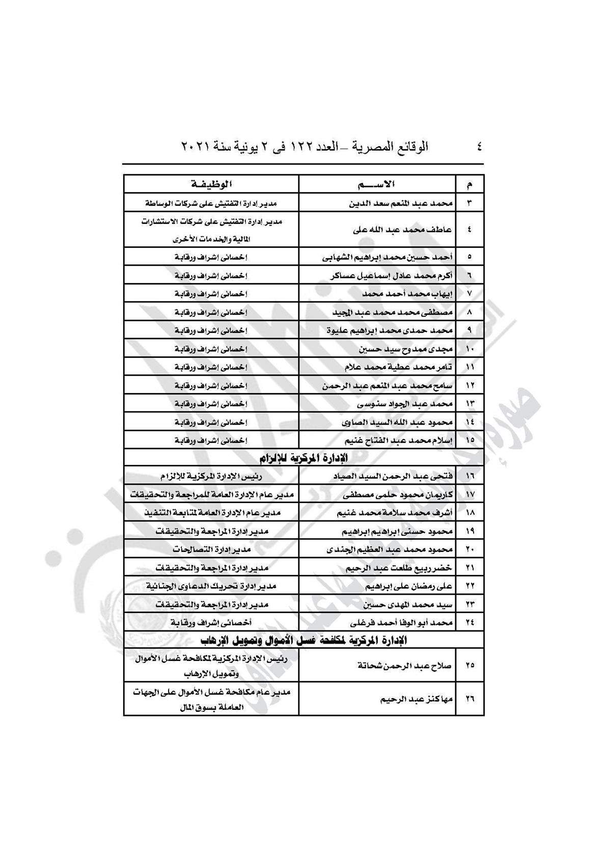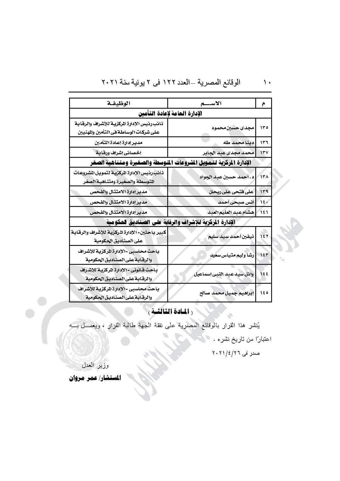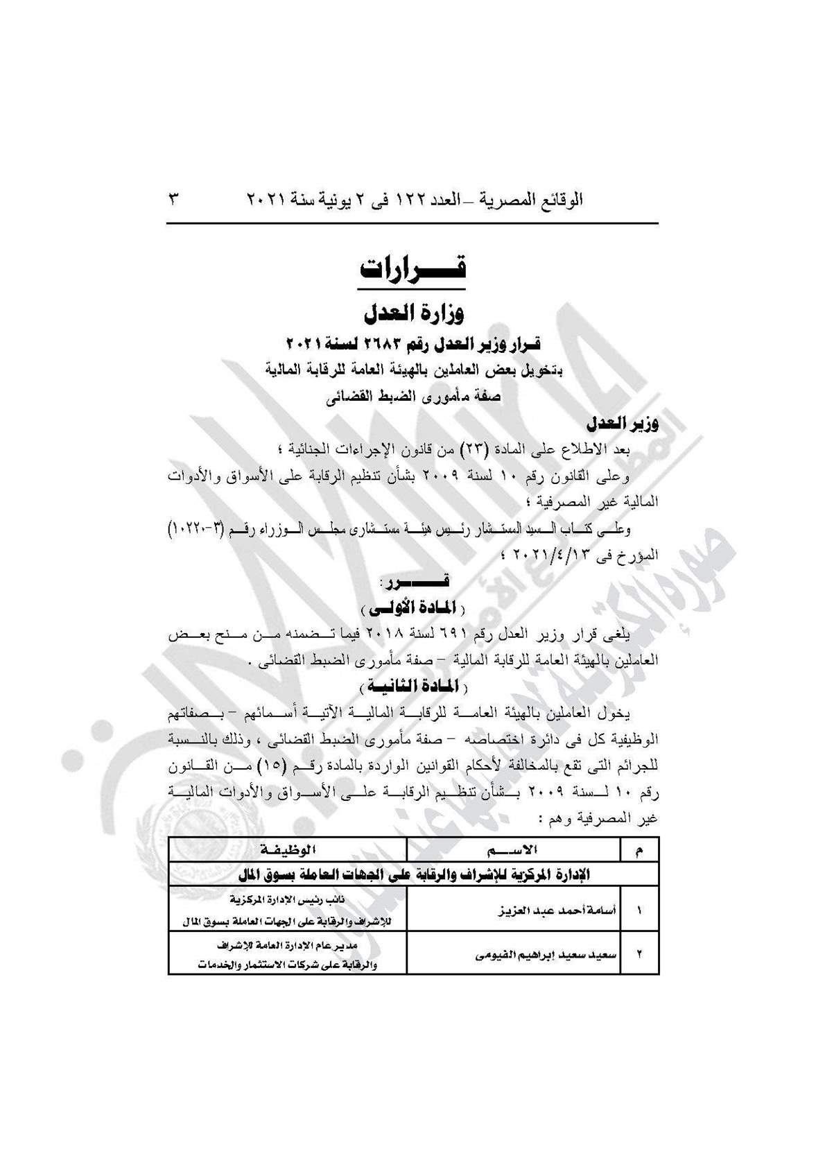 نشرت جريدة الوقائع المصرية في عددها رقم 122، الصادر في 2 يونية 2021، قرار وزير العدل المستشار عمر مروان رقم 2683 لسنة 2021، بشأن بتخويل بعض العاملين بالهيئة العامة للرقابة المالية صفة مأمورى الضبط القضائى.