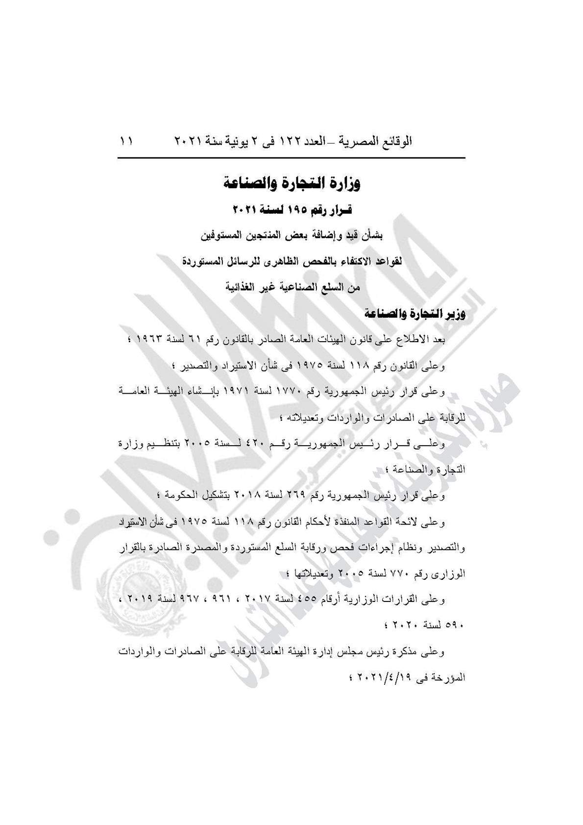 والقرار رقم 196 لسنة 2021، بشأن تقييد شركة منتجة في سجل منتجي السلع الصناعية غير الغذائية، والذي يكتفى بالفحص الظاهري ومطابقة البيانات المدونة على رسائلهم، طبقًا لما هو ثابت بمستنداتها، والمنشأ لهذا الغرض بالهيئة العامة للرقابة على الصادرات والواردات.
