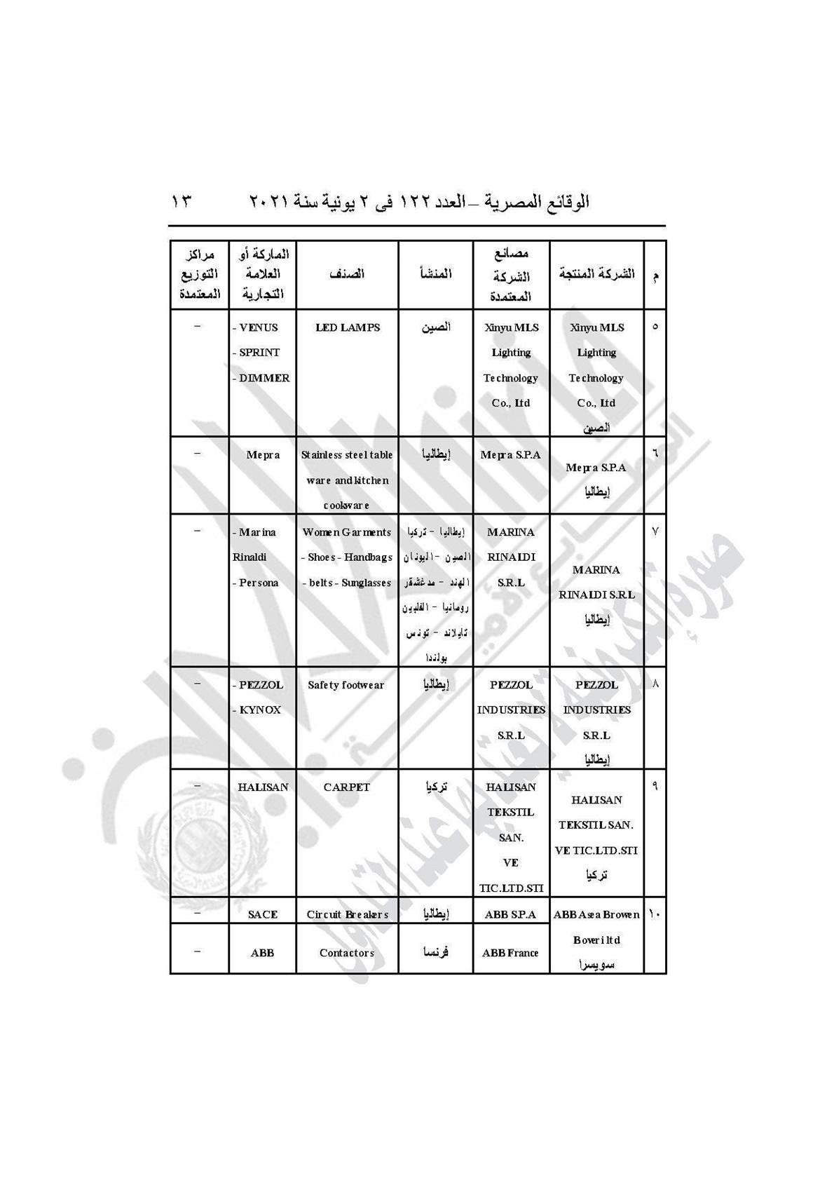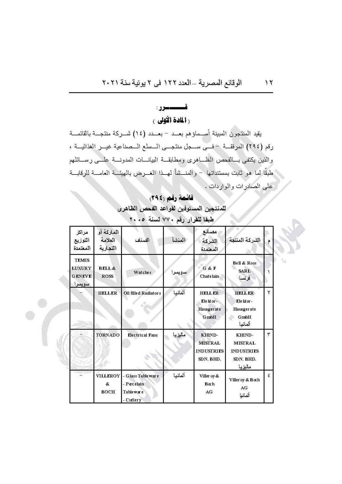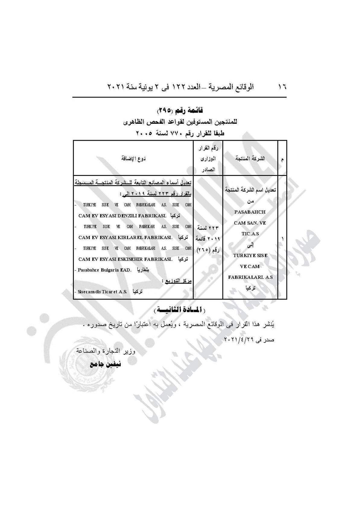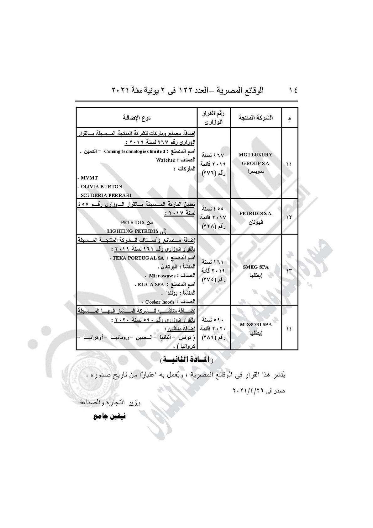 نشرت جريدة الوقائع المصرية في عددها رقم 122، الصادر في 2 يونية 2021، قرارى وزارة التجارة والصناعة بشأن قيد وإضافة 15 شركة منتجة بالقائمة 294، في سجل منتجي السلع الصناعية غير الغذائية.