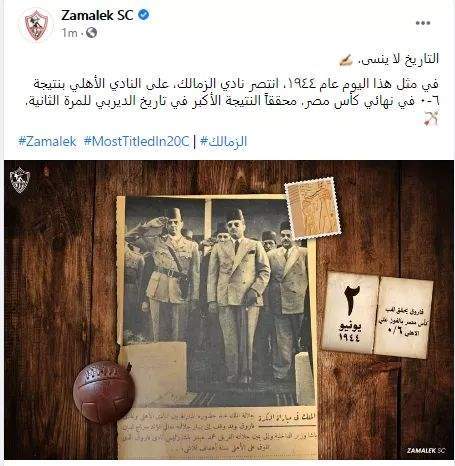 وكتب الصفحة: في مثل هذا اليوم عام ١٩٤٤، انتصر النادي على الأهلي بنتيجة ٦-٠ في نهائي كأس مصر. محققاً النتيجة الأكبر في تاريخ الديربي للمرة الثانية.