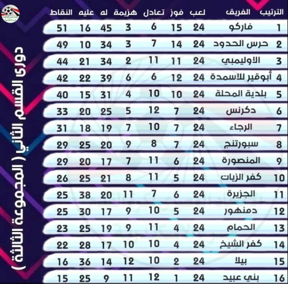 وجاء جدول ترتيب دوري القسم الثاني قبل مباريات اليوم كالتالي: