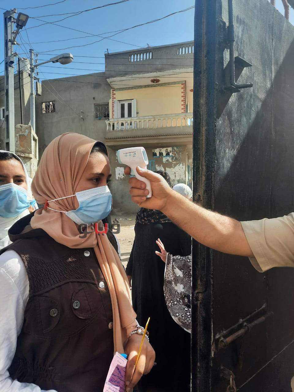 خضع طلاب وطالبات الشهادة الإعدادية في محافظة الدقهلية للكاشف الحراري على أبواب لجان الشهادة الإعدادية قبل دخول اللجنة لأداء امتحان مادة العلوم.