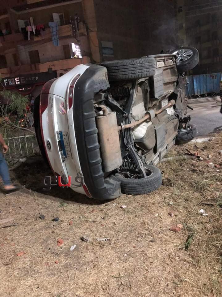 السرعة الزائدة واختلال عجلة القيادة وراء انقلاب سيارة أمام استاد طنطا | صور