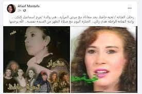 نشرت عفاف مصطفى صورة للفنانة الراحلة، عبر حسابها الشخصي بموقع التواصل الاجتماعي "فيس بوك" قائلة: رحلت الفنانة تحية حافظ.. بعد معاناة مع مرض المرارة.. هي والدة فرح إسماعيل كتكت، وابنة الفنانة الراحلة هدى زكي، الجنازة اليوم مع صلاة الظهر من السيدة نفيسة.. الله يرحمها.