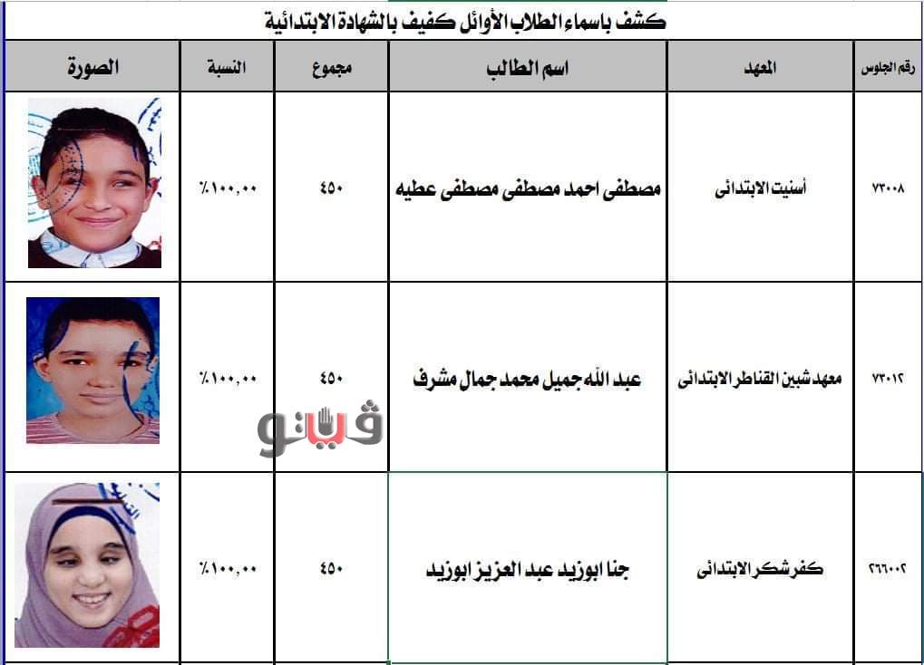 بمجموع 100% شبين القناطر وجنا ابو زيد عبد العزيز بمجموع 100% كفر شكر .