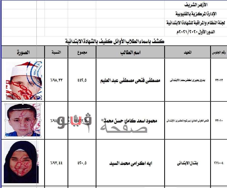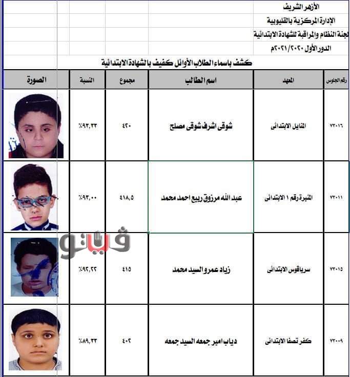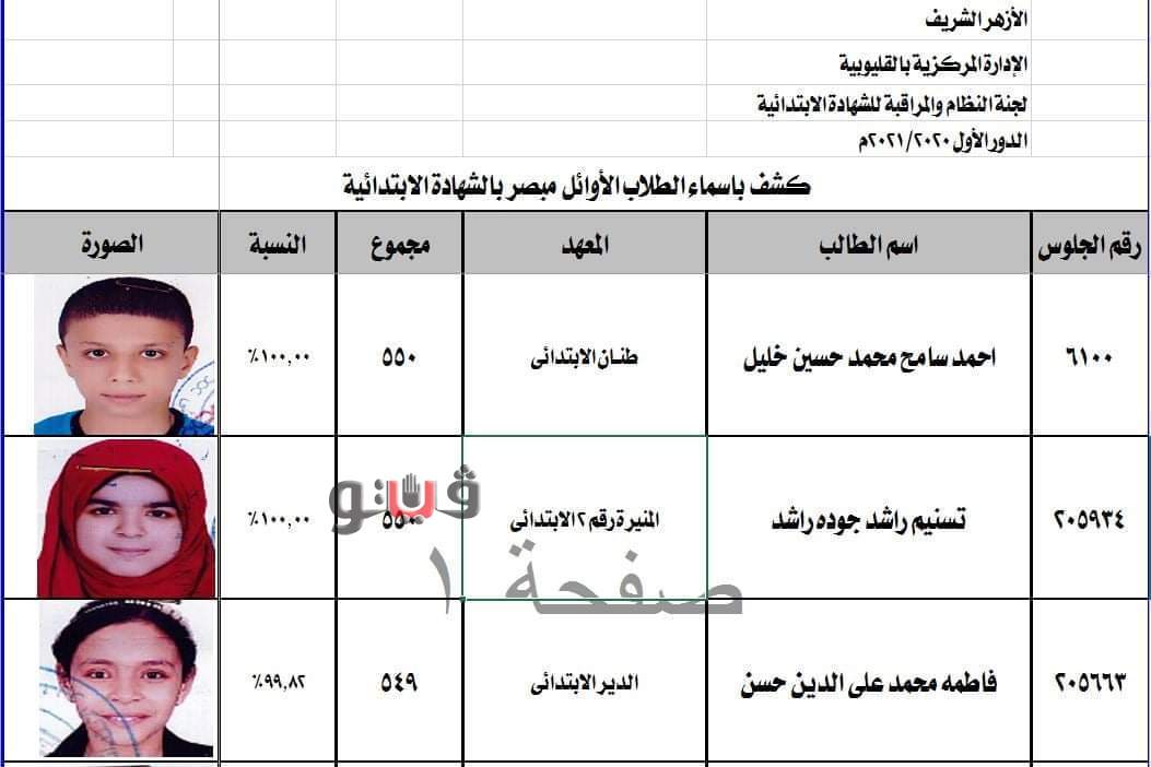 حصلت فيتو علي كشف باسماء اوائل الشهادة الابتدائية للتعليم الازهري بالقليوبية حيث تم تقسيمها الي اوائل المبصرين وحصل ٥ منهم علي مجموع 100%وهم رحمة كمال محمد حسين معهد ميت الحوفيين ومحمد احمد محمد بنها النموذجي ونادين وائل عبد السميع عبد المؤمن برشوم واحمد سامح محمد حسبن خليل طنان وتسنيم راشد جودة راشد المنير الابتدائي ٢ .