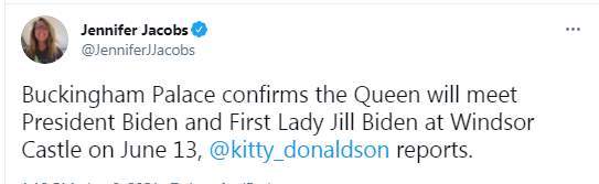 وكتبت جينفر جاكوبز تغريدة على تويتر قالت فيها: " يؤكد قصر باكنجهام أن الملكة ستلتقي بالرئيس بايدن والسيدة الأولى جيل بايدن في قلعة وندسور في 13 يونيو، بحسب تأكيدات كاتبة السياسة والأمن القومي في بلومبيرج كيتي دونالدسون".