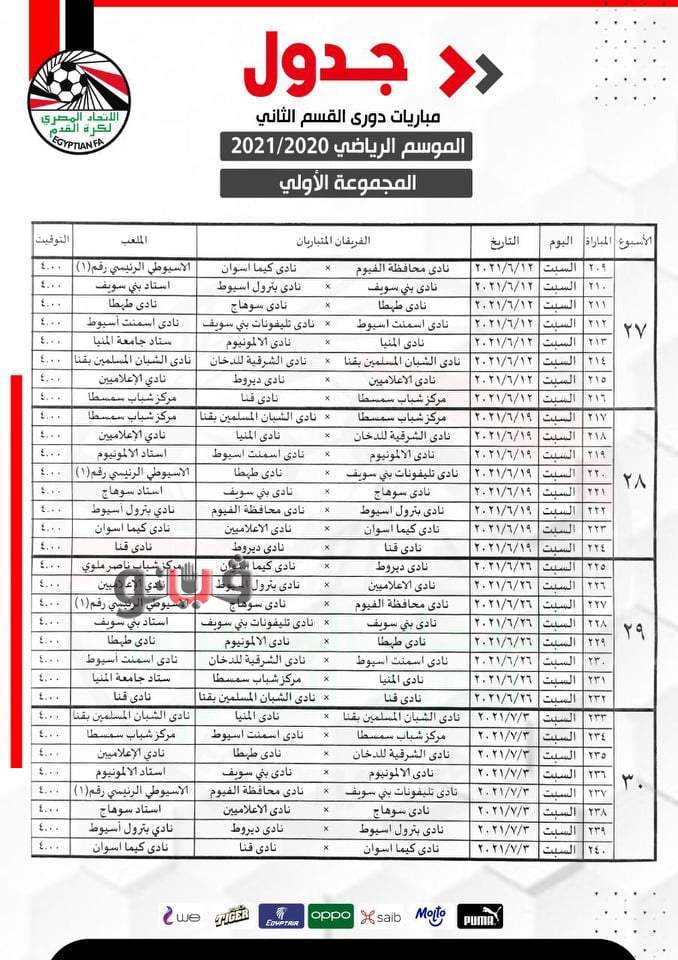 وجاءت تعديلات المجموعة الأولي " الصعيد " بمشاركة 16 فريقا والتي يتصدرها الشرقية للدخان كالتالي