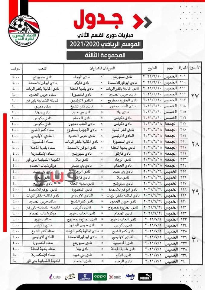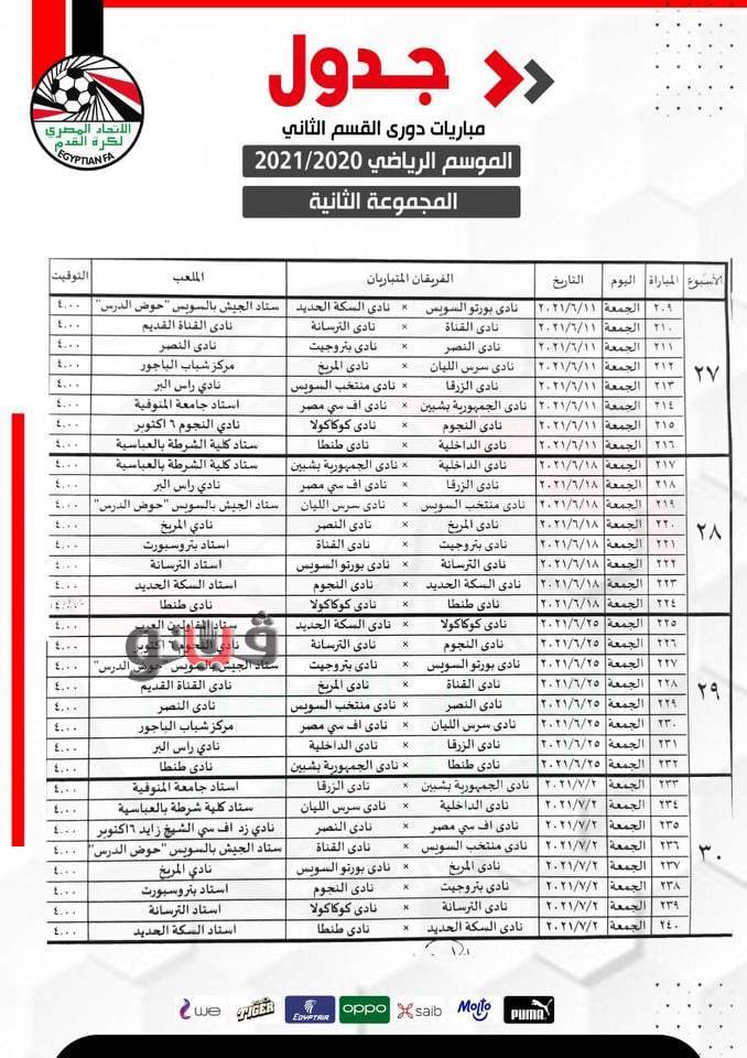 وجاءت تعديلات المجموعة الثانية "القاهرة والقناة" لدوري القسم الثاني بمشاركة 16 فريقا والتي يتصدرها بورتو برصيد 41 نقطة كالتالي