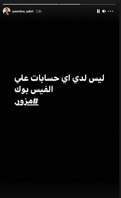 وخرجت ياسمين صبري عن صمتها للكشف عن حقيقة امتلاكها حساب رسمي على "فيس بوك"، حيث كتبت فى ستوري عبر حسابها الرسمي على موقع "انستجرام": "ليس لدي أي حسابات على فيس بوك.. مزور".