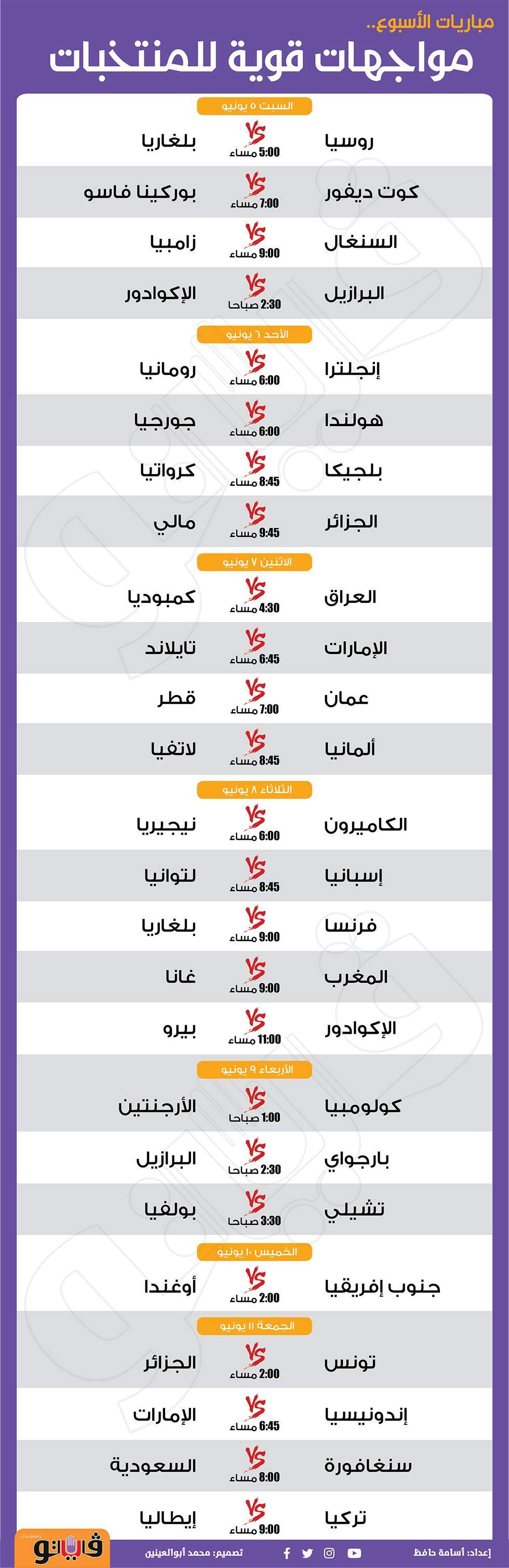 مباريات الأسبوع.. مواجهات قوية للمنتخبات | إنفوجراف الجمعة 04/يونيو/2021 - 09:48 م 6/4/2021 9:48:23 PM مباريات الأسبوع أسامة حافظ شارك طباعة 18 حجم الخط شارك طباعة مباريات الاسبوع مواعيد مباريات المنتخبات منتخبات