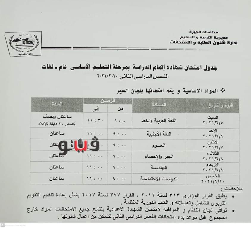 قبل انطلاقها.. جدول امتحانات الشهادة الإعدادية 2021 بالجيزة