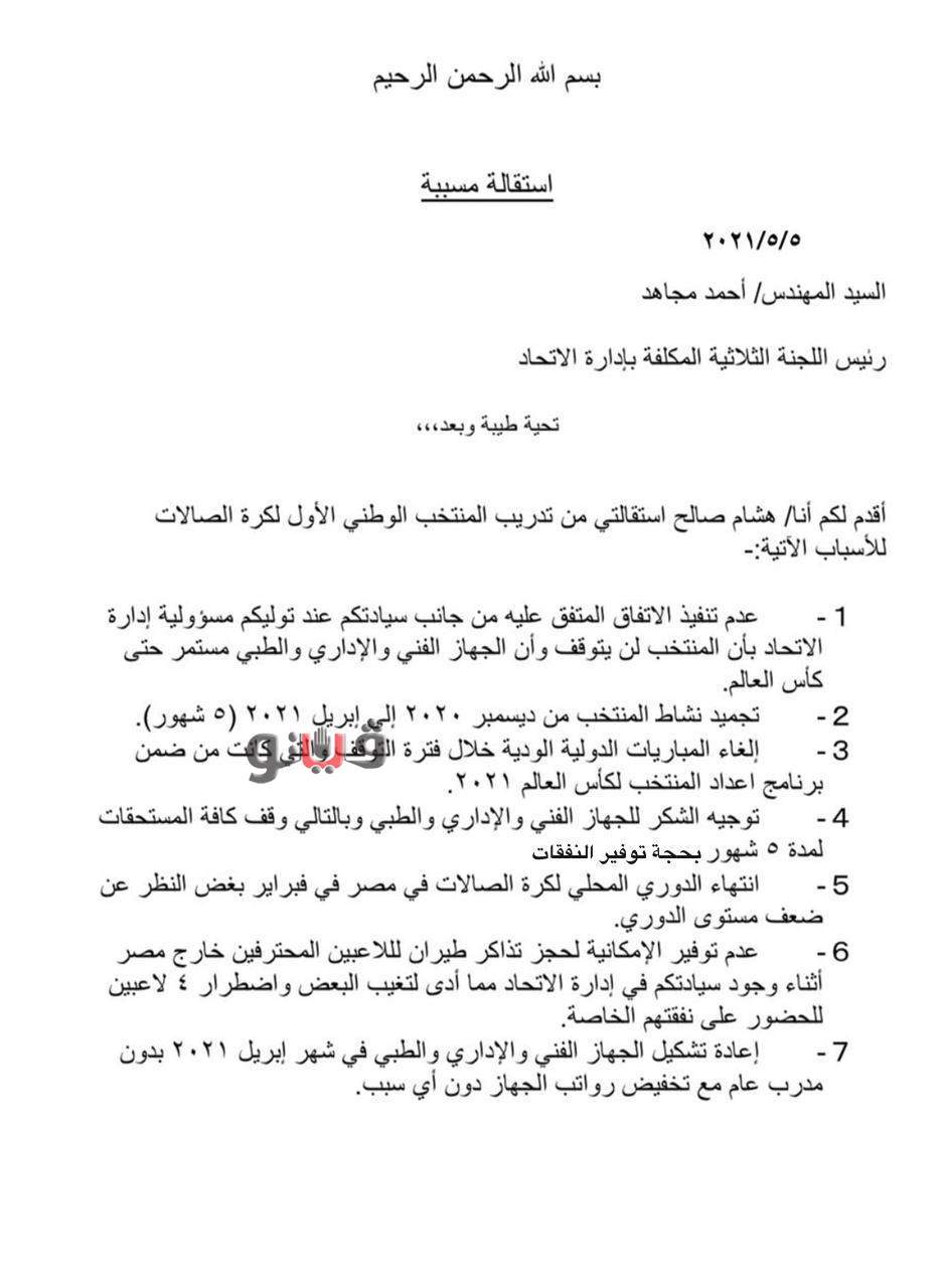 قدم هشام صالح المدير الفني لمنتخب مصر لكرة الصالات استقالة رسميا من تدريب المنتخب