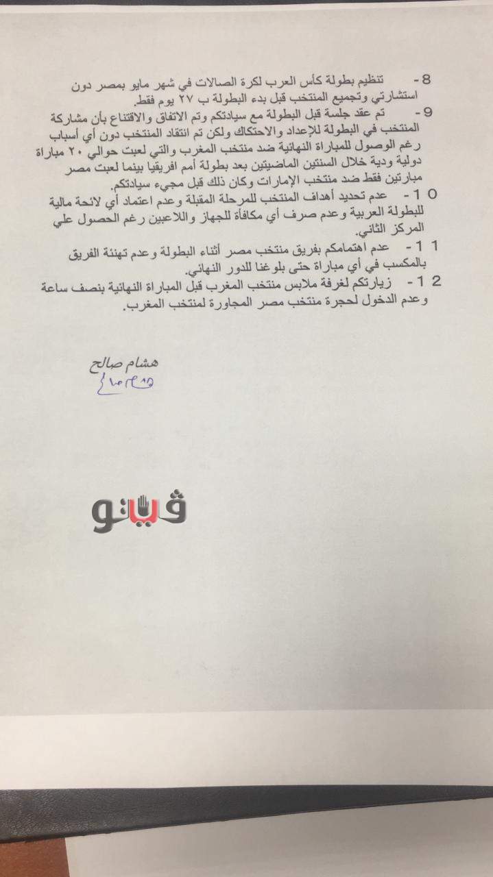 9- تم عقد جلسة قبل البطولة مع سيادتكم وتم الاتفاق بأن مشاركة المنتخب فى البطولة للإعداد والاحتكاك ولكن ان انتقاد المنتخب بدون اي أسباب رغم الوصول للمباراة النهائية ضد منتخب المغرب والتى لعبت حوالي 20 مباراة دولية ودية خلال السنتين الماضيتين بعد بطولة أمم أفريقيا بيننا لعبت مصر مباراتين فقط ضد منتخب الإمارات وكان ذلك قبل مجيئكم.