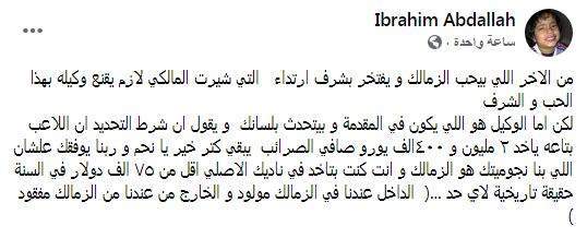 وكتب إبراهيم عبدالله عبر حسابه: "من الاخر اللي بيحب الزمالك ويفتخر بشرف ارتداء التي شيرت المالكي لازم يقنع وكيله بهذا الحب والشرف".