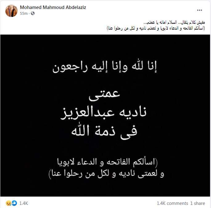 وكتب محمد محمود عبد العزيز قائلا: "مفيش كلام يتقال.. السلام أمانة يا عمتي (أسألكم الفاتحة والدعاء لأبويا ولعمتي نادية ولكل من رحلوا عنا)".